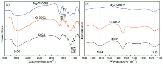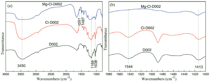 RESULTS AND DISCUSSION FT-IR and Py-IR analysis The FT-IR spectra Figure 1(a) of D002, Cl-D002 and MgSO4-Cl-D002 exhibited a broad band in the region 3450 cm−1, which was a attributed to the -OH stretching vibration. The D002 and Cl-D002 catalysts exhibit two bands at 1038 cm−1 and 1169 cm−1 which were attributed to symmetric and asymmetric stretching vibration of SO3-, respectively.23,24 The absorption peak of MgSO4-Cl-D002 appeared at 1038 cm−1, which were ascribed to the symmetric stretching vibration of SO3-. The absorption bands of MgSO4-Cl-D002 appeared at 1487 cm−1 and 1551 cm−1, which were ascribed to stretching modes of benzene ring.25 Meanwhile, Figure 1(b) showed the Py-IR spectra of D002, Cl-D002, and MgSO4-Cl-D002 catalysts. D002 and Cl-D002 catalysts exhibited bands at 1544 cm−1 and 1413 cm−1 that was assigned to pyridine bound to Brönsted and Lewis acidic sites, respectively.26 The absorption peak of MgSO4-Cl-D002 at 1413 cm-1 was assigned to Lewis acid site.