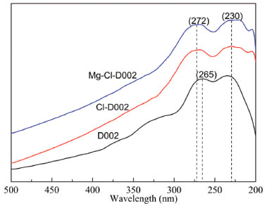 UV-Vis analysis Figure 2 presented the UV spectra of the samples, showing that D002, Cl-D002 and Mg-Cl-D002 had characteristic absorption peaks of benzene ring ranging from 200 to 300 nm, which were attributed to the π-π* transition of conjugate backbone.27 Compared with D002, the absorption peak of Cl-D002 and Mg-Cl-D002 shifted to 272 nm. This may be caused by the effect of electron withdrawing (Cl) and electron-donating group (Mg) in the -SO3H, which impacted on the benzene ring absorption. The D002, Cl-D002 and Mg-Cl-D002 were characterized by EDS to determine the elemental composition (Figure 1S). In the EDS spectrum, Mg, and Cl peaks were observed. The result agreed well with the UV-Vis analysis.28