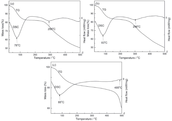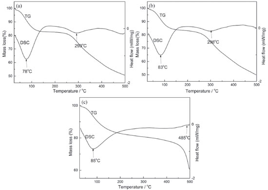 Thermal analysis Figure 4 displayed the TGA curves of all samples. Two kinds of weight loss were observed (Figure 4a, 4b, 4c curves TG and DSC). The first peak (78 °C, 83°C, and 85°C) was due to the removal of crystal water, and the second (293 °C, 298°C, and 485°C) corresponded to the removal of the SO3- group on the polystyrene,33 which is protected by Mg coordination.31 Accordingly, the thermal stability of the Mg-Cl-D002 catalyst was significantly improved.