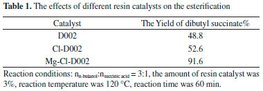 Catalytic performance The effects of the different catalyst of D002, Cl-D002 and Mg-Cl-D002 on the esterification reaction were investigated. The results are shown in Table 1. The reaction conditions were the following: nn-butanol:nsuccinic acid was 3, the amount of resin catalyst was 3%, reaction temperature was 120 °C and the reaction time was 60 min. The yield of dibutyl succinate for MgSO4-Cl-D002 reached to 91.6%, which increased by 42.8% compared with D002. The reason may be that introduction of Lewis acids enhanced the acid content of MgSO4-Cl-D002.