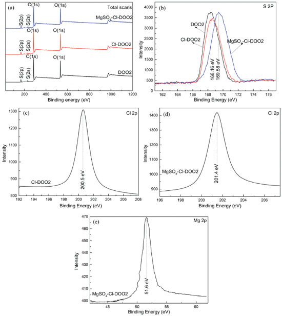 XPS analysis X-ray photoelectron spectroscopy (XPS) was utilized to identify the Mg and Cl states on the modified resin. Figure 3(a) presents XPS spectra for the D002, Cl-D002 and Mg-Cl-D002. Figure 3(b) showed the S 2p spectra of Cl-D002 at 168.16 eV and Mg-Cl-D002 at 169.58 eV, which suggested the presence of S6+.29 The Cl 2p XPS spectra (Figure 3c, 3d) of Cl-D002 and MgSO4-Cl-D002 show the presence of characteristics peaks at around 200.5 eV and 201.4 eV. Figure 3(e) showed the Mg 2p spectra of Mg-Cl-D002 at 51.6 eV, indicating the Mg coordination to the polystyrene sulfonic acid ions.30 The optimum monomer structures (Figure 2S) of D002, Cl-D002 and MgSO4-Cl-D002 have been studied using density functional theory methods at the B3LYP/6-311G(d,p) computational level (Table 1S), which agreein general with the structure reported in literature.31,32 The total energy of the Cl-D002 and MgSO4-Cl-D002 were lower than observed for the D002, so the optimum monomer structuresof Cl-D002 and MgSO4-Cl-D002 may exist.28