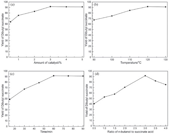 Figure 5. (a) Influence of amount of MgSO4-Cl-D002, (b) reaction temperature, (c) reaction time, and (d) nn-butanol:nsuccinic acid ratio. Other associated reaction conditions were the optimized conditions when one parameter was changed