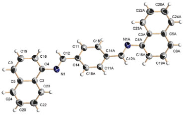 EXPERIMENTAL Materials and instruments All solvents and reagents were purchased as analytical grade from Sigma-Aldrich and used without further purification. Stock solution (1.0 x 10-3 mol L-1) of metal ions (nitrate and chloride salt) were prepared using in two-distilled water. The stock solution of sensor L (1.0 x 10-3 mol L-1) was prepared in acetonitrile. 1H-NMR spectra was recorded on a Bruker AV-400 spectrometer. The MS spectra was performed on Bruker Esquire 3000 Plus Ion Trap Mass Spectrometer. The IR spectra were collected on a Thermo Electron Nicolet 6700 FT-IR spectrometer with KBr pellets in the range 4000-400 cm-1. Elemental analysis was determined on an Elementar Vario EL III spectrometer. UV-vis spectra were examined on a Pgeneral TU-1901 spectrophotometer. Fluorescent spectra were recorded in Agilent Cary Eclipse spectrometer at room temperature. Melting point was determined on a Beijing XT4-100x microscopic melting point apparatus. Synthesis of sensor L An ethanol solution (10 mL) of 1-naphtylamine (2.13 g, 15.0 mmol) was added to another ethanol solution (10 mL) containing terephthalaldehyde (1.0 g, 7.5 mmol), then the solution was stirred for 2 h at 40 °C. The reaction mixture was allowed to settle down, and the precipitate formed was filtered and washed with ethanol and dried in vacuum. Block-shaped golden single crystals suitable for single crystal X-ray diffraction were grown from ethyl acetate by slow evaporation of the solvent over a period of several days. The compound L was characterized by elemental analysis, IR, 1H-NMR (Figures 1S-2S in Supplementary Material). Yield: 81% (2.32 g); C28H20N2: Anal. Found: C, 86.38; H, 5.67; N, 7.24%. Calc.: C, 87.47; H, 5.24; N, 7.29%; IR (KBr, cm-1): νH-C=, 3046, νC=N, 1615, νC-N, 1265. 1H NMR (400 MHz, δ, ppm in DMSO-d6): 8.86 (s, -CH=N, 2H), 8.36 (t, 2H), 8.28 (s, 4H), 7.98 (t, 2H), 7.85 (d, 2H), 7.59 (m, 6H), 7.33 (d, 2H). M.p.:184.7-185.4°C. Crystal structure determination Crystallographic measurements were made on a Bruker Smart CCD single-crystal diffractometer with MoKα radiation (λ = 0.71073 Å) by using φ and ω scan techniques at room temperature. Accurate unit cell parameters and the orientation matrix were obtained from least-squares refinement using the programs Smart and Saint, and the data were integrated using Saint. The structure was solved by Direct Methods (Shelxs-97) and refined by full-matrix least-squares techniques on F2 using Shelxs-97.27