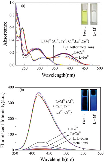 ![]() Figure 2. (a) UV-vis absorbance spectra and (b) Fluorescence spectra (λex=327 nm) of sensor L (10 µmol L-1) in the presence of different metal ions (10 µmol L-1) in ethanol solution. inset: the color (a) and fluorescence color (b) changes of sensor L in addition of M3+ (Al3+, Cr3+, Fe3+, La3+, Ce3+)