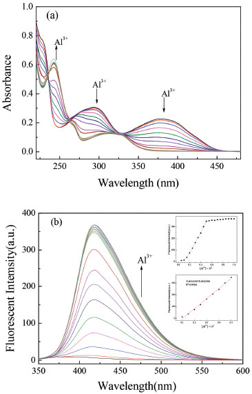 ![]() Figure 3. (a) UV-vis absorbance spectra and (b) Fluorescence spectra (λex=327 nm) of sensor L (10 µmol L-1) with gradual addition of Al3+ in ethanol solution (0.05, 0.1, 0.15, 0.2, 0.25, 0.3, 0.35, 0.4, 0.45, 0.5, 0.55, 0.6, 0.65, 0.7, 0.75, 0.8, 0.85, 0.9, 0.95, 1.0 equiv)