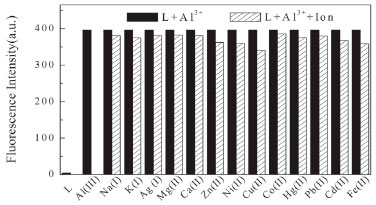 ![]() Figure 4. The selectivity of sensor L for Al3+ in the presence of other metal ions in ethanol solution (λex=327 nm). The response was normalized with respect to background fluorescence of the free sensor L (10 µmol L-1), Al3+ (10 µmol L-1) was added at first, then other metal ions were added (10 µmol L-1)