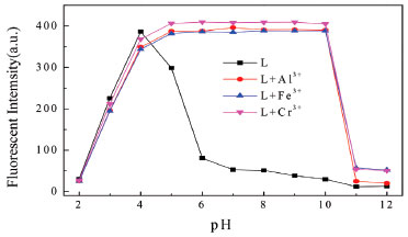 The pH effect The fluorescence responses of sensor L in the absence and presence of M3+ (such as Al3+, Cr3+ and Fe3+) (1 equiv) at different pH values were investigated (Figure 5). In the absence of trivalent metal ions, the fluorescence intensity of sensor L increased dramatically when the pH value gone up from 2 to 4. In the presence of trivalent metal ions at the same pH range of 2-4, the fluorescence responses were silimilar to that of the absence of M3+. However, it could be clearly seen that the fluorescene emission was greatly enhanced upon addition of M3+ (Al3+, Cr3+ and Fe3+) from pH 5 to 10, indicating the M3+ exerted a remarkable influence on the fluorescence response feature of sensor L over a broad range of pH. Upon the pH value was higher than 10, the fluorescent intensity decreased dramatically, which might be caused by the formation of metal hydroxide.31 The best pH under experimental conditions was 7.0, which was within the biologically relevant pH range (5.7-7.5),32 indicating that L could be applied as Al3+, Cr3+ and Fe3+ sensor under neutral environmental.33