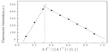 Job's plot For further determination of stoichiometry between L and M3+, Job's plot analyses were used. The total concentration of L and M3+ in each sample was 20 µmol L-1, in the experimental process, the concentration of L and M3+ changed correspondingly. In Figure 6, the plot of fluorescence intensity versus [Al3+]/[Al3++L] showed the maximum fluorescence value was 0.33, which indicated that the 2:1 stoichiometry between L and M3+ in ethanol solution. Similar results were also found for Cr3+ and Fe3+ (Figure 7S and 8S, Supporting Material).