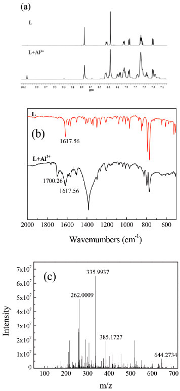 ![]() Figure 7. (a) 1H NMR spectra of L, L+Al3+ in DMSO-d6 (b) The IR spectrum of L, L+Al3+ (c) The ESI-MS spectrum of L in the presence of Al3+