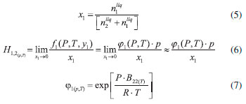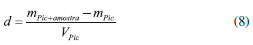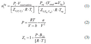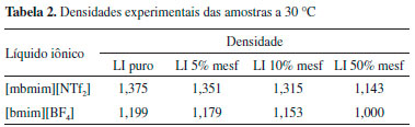 Para o ensaio de sorçao, foram testados os líquidos puros, e misturas de 5%, 10% e 50% de microesferas nos líquidos iônicos. Essas porcentagens dizem respeito ao volume de microesferas, ou seja, a amostra LI 10% mesf corresponde a 90% do volume de líquido iônico e os outros 10% do volume de microesferas de vidro. As misturas foram preparadas e uma massa aproximada de 12 g de amostra (mistura LI + mesf) foi adicionada no interior da célula de equilíbrio e aplicado 1 h de vácuo (10-2 bar) para retirada de umidade residual da amostra. Os ensaios de sorçao foram realizados em triplicata. Para cada teste, o vaso reservatório foi pressurizado com CO2(g) até a pressao de 27 bar nas temperaturas de 30 °C, 40 °C ou 50 °C. Após a pressurizaçao da célula de equilíbrio com o CO2 do vaso reservatório, o sistema foi mantido sob agitaçao constante em 1000 rpm, até que a amostra de líquido iônico e o CO2(g) alcançassem o equilíbrio termodinâmico. Para a etapa de dessorçao do CO2 no líquido, entre cada medida foi aplicado 1 h de vácuo. As equaçoes empregadas nos cálculos sao as seguintes (Eq. 1-7): ![]() em que Pi e Ti sao a pressao e a temperatura na primeira determinaçao PVT, e Peq e Teq sao a pressao e a temperatura no equilíbrio. Z1 é o fator de compressibilidade para o gás puro, e B22 (cm3 cm-1) é o segundo coeficiente virial para o gás puro, conforme a Eq. 4. ![]() Os coeficientes a, b e c para o CO2 foram consultados em banco de dados eletrônico (NPL, 2008), conforme segue: a = 137,6; b = 87,7 e c = 325,7. A solubilidade foi, entao, expressa em fraçao molar e calculada a constante de Henry para cada líquido iônico.33,34 ![]() sendo f1 a fugacidade do soluto, e φ1 é o coeficiente de fugacidade do soluto. Determinaçao da densidade das misturas A determinaçao da densidade das misturas de líquido iônico com as microsesferas de vidro nas concentraçoes de 5, 10 e 50% foi realizada com um picnometro de vidro de 10 mL devidamente calibrado e a densidade foi calculada segundo Eq. 8: ![]() A Tabela 2 mostra os resultados de densidade obtidos experimentalmente a 30 °C das misturas.