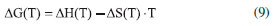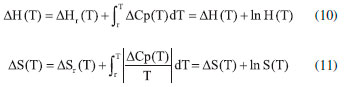 Determinaçao das propriedades termodinâmicas Quando consideramos as funçoes termodinâmicas de estado, energia livre de Gibbs (G), entalpia (H) e entropia (S), as mesmas sao correlacionadas pela Eq. 9, uma das equaçoes fundamentais da termodinâmica.35 ![]() A funçao ΔG (T), nao havendo mudança de fase, quando representada graficamente comporta-se como uma reta,36 sendo ΔH (T) o coeficiente linear e ΔS (T) o coeficiente angular. Considerando-se as grandezas H e S, à pressao constante, estas sao também funçoes da temperatura, conforme demonstrado nas Eq. 10 e 11: ![]()