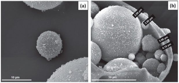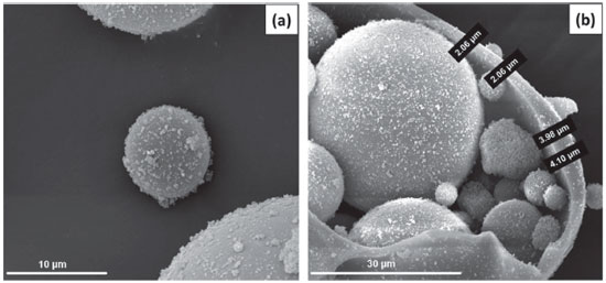 A caracterizaçao das microesferas de vidro foi realizada por microscopia eletrônica de varredura (MEV) em equipamento FEI Inspect F50 no modo de elétrons secundários (SE). As amostras foram dispostas em stubs e recobertas com uma fina camada de ouro. Para a obtençao das micrografias foi aplicada uma tensao de 10 kV. A Figura 1 apresenta imagens (MEV) mostrando que as microesferas analisadas possuem superfícies rugosas (Figura 1a) e diâmetros nao uniformes (Figura 1b) que variam de 2 a 30 mícron.