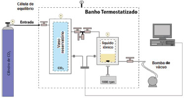 Ensaios de sorçao de CO2 Os ensaios de sorçao foram realizados numa célula de equilíbrio de volume constante com janelas de safira e os cálculos realizados pelo método da saturaçao isocórica. O esquema de montagem da célula de equilíbrio é ilustrado na Figura 2.