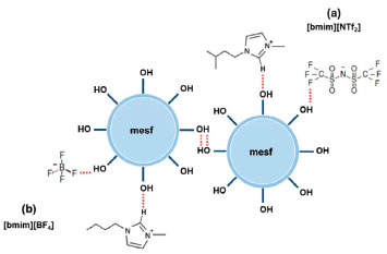 Para os sistemas híbridos, o sistema composto pelo líquido iônico [mbmim][NTf2] foi o que apresentou a maior incremento de fraçao molar. Essa melhoria na sorçao com o aumento da temperatura no sistema hidrofílico pode ser explicada pela relaçao entre o aumento de temperatura com o aumento da energia cinética das moléculas, enfraquecendo as prováveis ligaçoes de hidrogênio que ligam os íons dos LIs aos silanóis da superfície das microesferas de vidro, aumentando as distâncias intermoleculares e assim facilitando a difusao das moléculas do CO2.37 No arranjo tridimensional dos líquidos iônicos derivados dos imidazólios, os cátions e os ânions se auto arranjam, formando empilhamentos moleculares com canais onde os ânions se localizam no centro destes túneis.38 Os líquidos iônicos interagem fortemente com os silanóis presentes nas partículas de SiO2 formando ligaçoes de hidrogênio, como mostrado na Figura 4.39