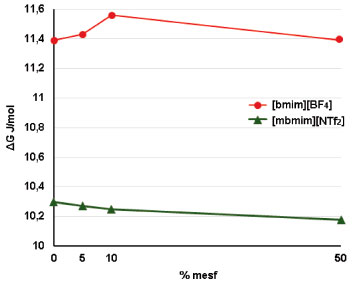 ![]() Figura 5. Energia Livre de Gibbs versus % microesferas de vidro para o sistema puro e misto de [bmim][BF4] e [mbmim][NTf2] com microesferas de vidro