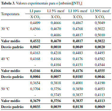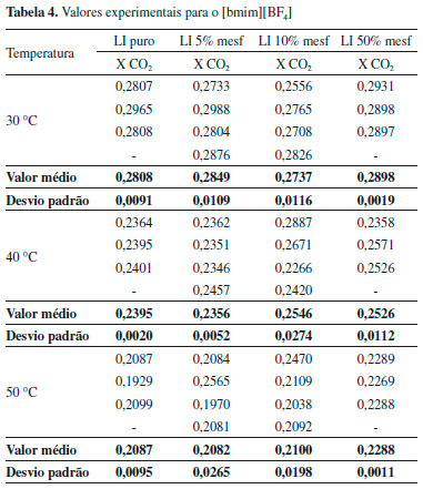 RESULTADOS E DISCUSSAO Sorçao de CO2 Os resultados obtidos com a célula de equilíbrio isocórica para os sistemas de líquidos iônicos [mbmim][NTf2] (Tabela 3) e [bmim][BF4] (Tabela 4) puros e com as microesferas de vidro nas concentraçoes 5%, 10% e 50% sao apresentados e representados na Figura 3, na qual é apresentado o efeito da adiçao das microesferas de vidro no valor de solubilidade de CO2 obtido em funçao da temperatura.