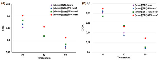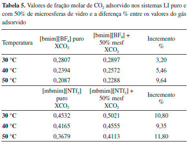 Como pode-se observar na Figura 3, se constata que o sistema híbrido microesferas de vidro - [mbmim][NTf2] (hidrofóbico) apresenta um comportamento homólogo àquele desenvolvido pelo LI [bmim][BF4], e que apresentaram resultados de adsorçao melhores do que aos o LI puro, independente da concentraçao de microesferas e da temperatura. No entanto, no caso presente com [bmim][BF4], o incremento de capacidade de adsorçao foi menor do que aquele obtido com o líquido iônico [mbmim][NTf2]. Observamos que o sistema híbrido com LI hidrofóbico ([mbmim][NTf2]), Figura 3a, apresentou uma sorçao de CO2 superior àquela do líquido iônico puro em qualquer das concentraçoes de microesferas. No sistema híbrido hidrofílico ([bmim][BF4]), Figura 3b, observou-se um comportamento diferente. Uma sorçao superior no LI hidrofílico foi obtida somente na concentraçao de 50% de microesferas, nas demais concentraçoes de microesferas o sistema apresentou fraçoes molares de CO2 inferiores aquelas do líquido iônico puro. Nos sistemas híbridos [mbmim][NTf2] - microesferas de vidro se observa resultados de sorçao significativamente melhores do que o do LI puro e resultados consistentes de aumento da sorçao à medida que se aumentou o volume de microesferas, sugerindo que o aumento da área superficial disponível no sistema facilita a difusao e sorçao do CO2 pelo líquido iônico. Já no sistema híbrido com [bmim][BF4], o comportamento só se altera com concentraçoes elevadas de microesferas, nas quais a disponibilidade de área superficial passa a ser significativa. Na Tabela 5 sao apresentados os valores de fraçao molar em funçao da temperatura dos sistemas mistos com 50% de microesferas comparado com o liquido iônico puro, bem como o incremento da fraçao molar obtida pela adiçao das microesferas onde se pode observar a diferença de comportamento entre os líquidos iônicos hidrofílico e hidrofóbico. No caso do líquido iônico hidrofílico ([bmim][BF4]), o aumento de temperatura do sistema melhorou o desempenho de sorçao, enquanto que no sistema com líquido iônico hidrofóbico ([mbmim][NTf2]) o aumento de temperatura nao impactou significativamente o desempenho de sorçao, mantendo-se praticamente constante em funçao da temperatura.