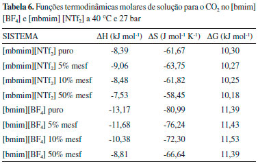 Sabemos que a hidrofobicidade depende diretamente da densidade de carga do ânion,40,41 assim, se considerarmos que a carga do ânion [NTf2-] é mais deslocada do que a do [BF4-], os líquidos iônicos com ânions [NTf2-] sao mais hidrofóbicos que os líquidos iônicos com [BF4-], o que nos permite deduzir que a forte atratividade entre as moléculas dos silanóis e os ânions [BF4-] provoca a formaçao de ligaçoes de hidrogênio e a aproximaçao espacial destas, enquanto que ligaçoes de van der Waals geram uma fraca atratividade do ânion hidrofóbico [NTf2-] e os silanóis e, portanto, espacialmente mais afastada, justificando os comportamentos diferenciados dos líquidos iônicos estudados. Neste último caso, a maior disponibilidade de espaços vazios intermoleculares facilitaria a permeaçao e fixaçao das moléculas de dióxido de carbono. Por estas interaçoes (pontes de hidrogênio e van der Waals) serem fracas, nenhuma delas é visível por espectroscopia na regiao do infravermelho.42,43 Constantes termodinâmicas da sorçao de CO2 Com os dados de equilíbrio líquido vapor obtidos foram calculadas a entalpia molar, a entropia molar e a energia livre de Gibbs para a sorçao do CO2 nos diversos sistemas estudados. Estes resultados sao apresentados na Tabela 6 para os sistemas com os líquidos iônicos [mbmim][NTf2] e [bmim][BF4], respectivamente. Os valores obtidos para variaçao de entalpia, de entropia e da energia livre de Gibbs dos sistemas estudados sao consistentes com aqueles publicados anteriormente.44,45