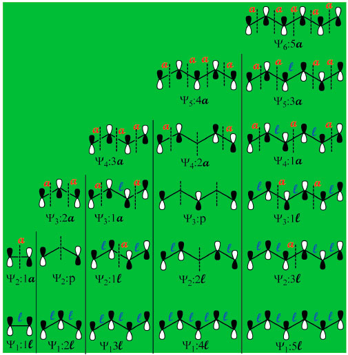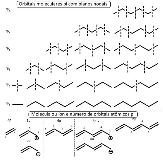 ![]() Figura 5. Topologia e energias relativas dos orbitais π para moléculas e íons acíclicos conjugados de 2 a 6 átomos empregando o procedimento alternativo