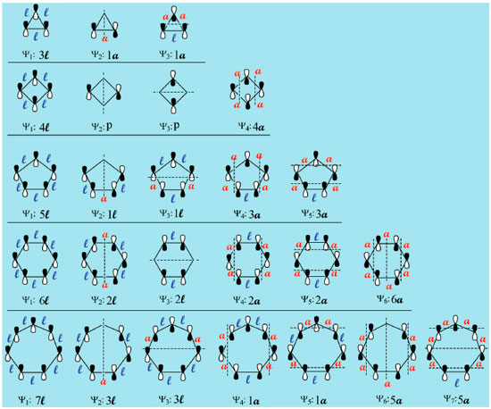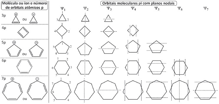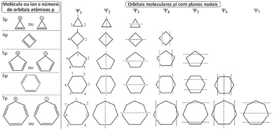 Figura 7. Topologia dos orbitais π e deduçao das energias relativas para moléculas e íons cíclicos conjugados de 3 a 7 átomos empregando o procedimento alternativo