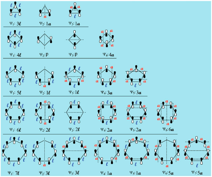 É importante destacar que as estruturas devem ser escritas com um dos lados para baixo, exceto para o anel de quatro átomos, que é escrito com um vértice para baixo, Figura 4, e que a localizaçao dos planos sempre inicia em Ψ2 pela vertical, mantendo-se daí em diante a alternância vertical/horizontal até preencher todos orbitais moleculares Ψn. Para cumprir o critério de máxima simetria na localizaçao de número ímpar de planos nodais, alguns planos podem ficar localizados diretamente sobre um ou dois átomos da estrutura em alguns Ψn ao passar por seu centro geométrico, dividindo-a ao meio. O recomendável é que o estudante inicie a análise pelo anel de três átomos, aproprie-se do procedimento descrito nos Passo 1-3 da Figura 3 e entao aplique-os ao anel imediatamente superior em número de átomos, fazendo toda a análise até o anel de sete átomos, um de cada vez. O resultado apresentado na Figura 7 deve ser reproduzido antes que o estudante avance na deduçao das energias de cada orbital, para que possa seguir com segurança na etapa da comparaçao das energias do sistema cíclico com o acíclico abaixo descrita.