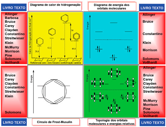 A proposta se baseia na construçao da topologia dos orbitais moleculares9 que representa a combinaçao linear dos orbitais atômicos p do carbono, permitindo deduzir a natureza ligante e antiligante de cada orbital e avaliar qualitativamente suas energias relativas e, assim, comparar a energia total de estabilizaçao dos elétrons dos polienos cíclicos conjugados e íons orgânicos com a dos correspondes polienos acíclicos. Dessa forma, a degenerescência dos orbitais do benzeno e também a energia relativa dos orbitais dos polienos sao deduzidas pelo próprio estudante, suplantando a descriçao estática dos livros textos amplamente empregados na graduaçao.10 Critérios apresentados nos livros de graduaçao para avaliar aromaticidade e energias relativas dos orbitais moleculares Para verificar o tipo de argumentaçao didática presente nos textos de graduaçao, uma amostra representativa de treze livros foi analisada, desde clássicos como o Morrison e Boyd até livros mais recentes, e assim avaliar a perenidade dos critérios empregados na explicaçao da aromaticidade tendo o benzeno como modelo.10 A maioria tem traduçao para a língua portuguesa, sendo dois de autores brasileiros, e na Figura 2 estao reunidos os recursos gráficos empregados nestes livros para ensinar os argumentos que conduzem o estudante a compreender a maior estabilidade do benzeno, em funçao da aromaticidade, quando comparada aos polienos de cadeia aberta. Nao foi incluída a comparaçao entre reaçao de adiçao a alcenos versos substituiçao eletrofílica aromática, que evidencia a diferença de reatividade, pois esta nao é a explicaçao da aromaticidade, é a sua consequência.