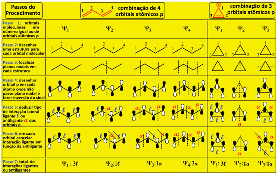 O Passo 1 é determinar o número de orbitais atômicos p paralelos e adjacentes da estrutura em análise que dao origem aos orbitais moleculares Ψ. Para os sistemas π conjugados aqui descritos, cada átomo contribui com um orbital atômico p para formar o circuito de elétrons π. Assim, a construçao da combinaçao linear dos orbitais atômicos de um dado sistema de n átomos na estrutura resulta em n orbitais moleculares, ou seja, Ψ1, Ψ2, até Ψn (ver Passo 1 da Figura 3 para o anel de três carbonos). O Passo 2 é desenhar uma estrutura de linhas para cada Ψn. O Passo 3 consiste em localizar o plano nodal em cada estrutura desenhada, com a máxima simetria possível e, para os polienos acíclicos, sao empregados planos verticais que sao distribuídos tendo como referencial o centro geométrico do sistema π conjugado. Havendo mais de um plano, estes sao localizados equidistantes a este centro guardando a máxima simetria possível, como se em cada orbital molecular Ψn o centro geométrico do sistema π conjugado fosse uma espécie de espelho interno, que reflete cada plano de uma metade do sistema π da molécula na outra metade, sendo indicado na Figura 3 para o butadieno. Os planos nodais verticais sao distribuídos em número crescente, iniciando em Ψ2 pois todo Ψ1 nao possui plano nodal. Para os demais polienos acíclicos sao empregados planos verticais tantos quantos forem necessários, sempre distribuídos tendo como referencial o centro geométrico do sistema π conjugado, sempre localizados equidistantes a este centro, com a máxima simetria possível, como indicado no Passo 3, o que resulta na Figura 4. É por este critério que, quando o sistema π conjugado está contido em número ímpar de átomos, alguns planos ficam localizados diretamente no átomo central do sistema.