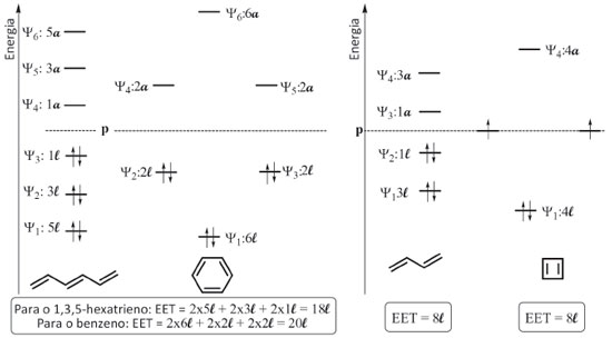 No cômputo da EET do benzeno, os seis de átomos de carbono sao capazes de estabilizar mais intensamente a mesma quantidade de elétrons π que o mesmo número de átomos no 1,3,5-hexatrieno, uma vez que a EET destas duas moléculas sao 20l e 18l, respectivamente, Figura 9. Como o número de carbonos é o mesmo, podemos aplicar diretamente estes valores como indicativos da maior estabilidade do benzeno em relaçao ao polieno acíclico; ao se aplicar a razao EET/noCarbono, chega-se ao valor 3,3l, que é 10% superior ao do 1,3,5-hexatrieno. Por ambas as análises se conclui que essa melhor acomodaçao dos elétrons π no benzeno, consequência da existência de orbitais degenerados e da menor energia relativa destes elétrons, é funçao da sua aromaticidade. Para ilustrar a aplicaçao do método alternativo na análise de antiaromaticidade, é feita a comparaçao do ciclobutadieno com o 1,3-butadieno na Figura 9. Pelo método alternativo chega-se ao mesmo valor de EET para as duas substâncias e nao num valor menor para o polieno cíclico, como evidenciado para o par benzeno/1,3,5-hexatrieno. O fato do ciclobutadieno nao estabilizar os elétrons π mais intensamente que o correspondente polieno acíclico é agravado pela verificaçao da existência de dois orbitais moleculares degenerados cujas energias sao de igual valor ao do orbital atômico p do carbono, e que dois elétrons desemparelhados ocupam estes dois orbitais moleculares, o que confere um caráter de biradical à substância. Todos estes aspectos explicam o comportamento antiaromático do ciclobutadieno e, portanto, sua maior instabilidade em comparaçao ao 1,3-butadieno, que possui todos os elétrons π emparelhados e num patamar energético inferior ao do orbital atômico p do carbono.