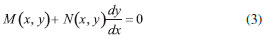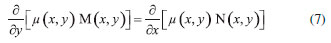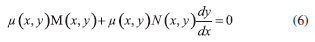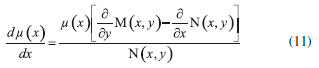 UM POUCO DE MATEMATICA: EQUAÇOES DIFERENCIAIS EXATAS E INEXATAS Iremos considerar nesse texto apenas as funçoes de duas variáveis que sao as mais importantes em um curso inicial de termodinâmica. Um pouco do formalismo das equaçoes diferenciais fornece, como veremos, todas as ferramentas necessárias para o estudo das funçoes de estado e variáveis de processo. Seja uma funçao de duas variáveis f(x,y), cujas derivadas parciais sao contínuas em um plano R2 conexo. A diferencial total de f(x,y) é dada por: ![]() para f(x,y) = c, onde c é uma constante arbitrária, temos que: ![]() Nessas condiçoes podemos gerar uma equaçao diferencial de primeira ordem calculando a diferencial total de f(x,y). Inserindo as notaçoes M(x,y) = f(x,y)/x e N(x,y) = f(x,y)/y, podemos reescrever a Equaçao 2 na seguinte forma: ![]() Logo, a Equaçao diferencial 3 e, consequentemente a Equaçao 2, é denominada uma equaçao diferencial exata se, e somente se, a igualdade entre as derivadas cruzadas em (4) for satisfeita em todos os pontos do plano R2 conexo. ![]() A igualdade (4) também é conhecida como condiçao ou critério de Euler para a distinçao entre equaçoes diferenciais exatas e inexatas. A vantagem de uma dada funçao f(x,y) satisfazer o critério de Euler, quando sua diferencial pode ser escrita como na Equaçao 1, está no cálculo da integral sobre um caminho C, que se torna simplificado. Nesse caso, a integral de f nao depende do caminho, mas somente dos extremos especificados: ![]() onde Algumas equaçoes diferenciais nao podem ser resolvidas diretamente. Entretanto, ao multiplicá-las por uma determinada funçao µ, conhecida como fator integrante, é possível obter uma soluçao para tal equaçao diferencial. Tal artifício é conhecido como método de Leibniz. Para algumas equaçoes diferenciais inexatas é possível utilizar o método de Leibniz para torná-las equaçoes diferenciais exatas. Para exemplificar, podemos considerar a Equaçao diferencial 3 e assumir que essa é inexata neste momento. Multiplicando essa equaçao por uma funçao µ(x,y) obtemos: ![]() Para satisfazer a condiçao de Euler, temos que: ![]() logo, ![]() aqui o problema pode ser simplificado se o fator integrante, ou seja, a funçao µ(x,y), for de uma única variável, tal como µ(x,y) → µ(x). Sendo assim, a Equaçao 7 pode ser escrita como: ![]() rearranjando os termos: ![]() finalmente: ![]() Sendo assim, se