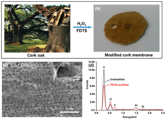 ![]() Figure 1. (a→b) Fabrication process of cork membrane with superhydrophobicity and superoleophilicity. (c) FESEM images of the modified cork membrane, The inset shows the magnified image of cell wall. (d) EDAX spectra of the modified cork membrane