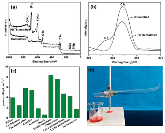 ![]() Figure 2. (a) XPS spectra of the cork membrane before and after FDTS modification. (b) The high-resolution spectra of C 1s of the FDTS-modified cork membrane. (c) Permeability of the modified membrane to various oils. (d) The separation of a kerosene/water mixture (2:1, v/v) with the device at a 15° tilt angle