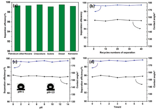 ![]() Figure 3. Oil and water separation and water contact angles studies of the modified cork membrane: (a) Separation efficiency for a series of oil and water mixtures. (b) after 40 separation cycles. (c) Exposed to water at different pH. (d) at a temperature of 60 ºC with a relative humidity of 90%