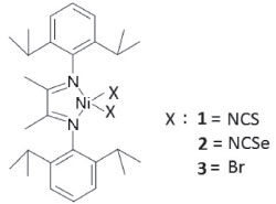 RESULTS AND DISCUSSION In this work two Ni diimine complexes containing the pseudo-halides isothyocyanate and isoseleniumcyanate as non-chelating ligands were synthesized and tested as pre-catalyst for ethylene polymerization in different reaction condition. The performance of these complexes in catalyzing the polymerization was compared with the analogous complex containing bromide. Polymerization behavior Ethylene polymerization were carried out by using pressures varying from 1 to 3 bar, temperature from 0 to 50 °C and Al/Ni molar ratio from 127 to 460, following an experimental design in which it was taken the temperature of 25 °C as a central point (triplicate). The results of these tests are presented in Tables 1, 2 and 3.