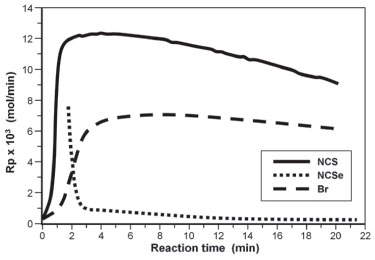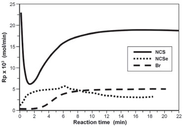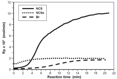 CONCLUSIONS This work presented data on the ethylene polymerization catalyzed by two Ni diimine precursor containing the pseudo-halides isothiocyanate and isoseleniumcyanate as non-chelating ligand, activated by MAO. Both complexes presented high catalyst activity toward the monomer, producing branched polyethylenes. The kinetic behavior of the polymerizations was dependent upon the structure of the non-chelating ligand and reaction conditions, what could be explained considering that the active site is an ion pair formed by the diamine Ni cation and a counterion made up by MAO and the abstracted multi-atomic non-chelating ligand. The type of non-chelaging ligand modifies the interaction of the counterion with the metal center, influencing mainly the stability of the active site and, consequently, the catalyst activity. The 1/MAO system proved to be by far the most active system in ethylene polymerization in this work, with polymerization rate even 3 times that of the analogous Br complex 3 and better performance at Al/Ni molar ratio between 200 and 300.