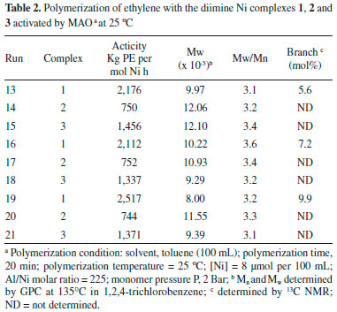 EXPERIMENTAL Materials The reactions were performed using standard Schlenk techniques. Nitrogen, argon and ethylene were purified by passing them through columns of 3 Å molecular sieves and copper catalyst. Toluene was distilled with sodium and benzophenone under nitrogen. CH2Cl2 and MeCN were dried with CaH2, distilled and used immediately. MAO (Witco) was purchased as a 10% toluene solution. 88% formic acid (Vetec), 97% 2,3-butanedione (Aldrich) and 90% 2,6-diisopropylaniline (Aldrich) were used as received. Synthesis of Ni-diimine complex The nickel diimine complexes DADNiX2 1, 2 and 3 (DAD=2,6-iPr2-C6H3-N=C(Me)-C(Me)=N-C6H3-2,6-iPr2; X= NCS 1, NCSe 2 and Br 3 (Figure 1) were synthesized according procedures previously reported.29,30