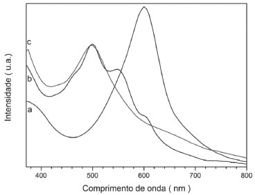 ![]() Figura 2. Espectros eletrônicos do complexo de rutênio em: (a) acetonitrila {[RuCl2(ENAPY)]}; (b) acetonitrila contendo 5% v/v de água destilada após 5 minutos {[RuCl(H2O)(ENAPY)]+ intermediário, nao isolado}; (c)acetonitrila contendo 5% v/v de água destilada após 20 minutos {[Ru(ENAPY)(H2O)2]2+}, à temperatura ambiente