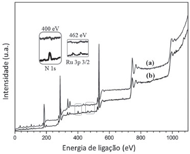 ![]() Figura 3. Espectros de XPS da MOF UiO-67 (a), e da MOF UiO-67 modificada com complexo de rutênio (b). Em destaque os sinais referentes as transiçoes eletrônicas envolvendo orbitais 1s do N e 3p2/3 do Ru(II)