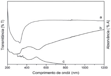 ![]() Figura 4. Espectros eletrônicos na regiao do UV-Visível dos compostos: (a) MOF UiO-67 (modo refletância difusa); (b) MOF UiO-67 modificada com complexo de rutênio (modo refletância difusa); (c) complexo de rutênio em soluçao aquosa