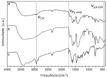 ![]() Figura 6. Espectros vibracionais na regiao do infravermelho dos compostos: (a) MOF UiO-67 modificada com complexo de rutênio; (b) MOF UiO-67; (c) complexo de rutênio, obtidos em pastilha de KBr