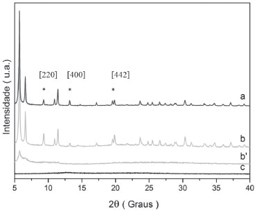 ![]() Figura 7. Difratogramas de raio-X método do pó dos compostos: (a) MOF UiO-67 modificada com complexo de rutênio; (b) MOF UiO-67 após etapa de secagem; (b')MOF UiO-67 antes da etapa de secagem; (c) complexo de rutênio