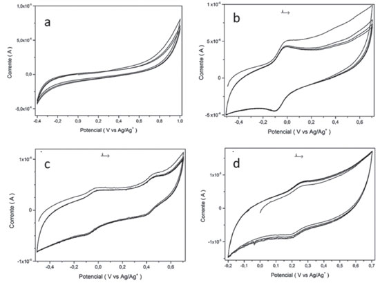 Figura 5. Voltamogramas cíclicos de: (a) MOF UiO-67; (b) complexo de rutênio em acetonitrila; (c) complexo de rutênio em acetonitrila contento água destilada; (d) MOF UiO-67 modificada com complexo de rutênio. Solvente acetonitrila contendo 0,10 mol L-1 de LiClO4, eletrodo de trabalho: platina; eletrodo de referência: Ag/AgNO3 0,01 mol L-1 + LiClO4 0,10 mol L-1; eletrodo auxiliar: fio de platina, sentido de varredura anódico, velocidade de varredura 100 mV s-1