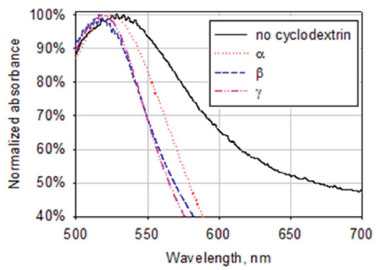 ![]() Figure 1. Absorbance spectra of the reaction mixtures containing KOH, HAuCl4 and cyclodextrins after 4 days of storage at room temperature