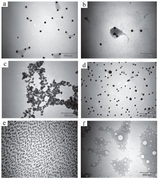 Figure 2. TEM images of the sample containing KOH, HAuCl4 and γ-cyclodextrin after 3 weeks of storage at 4 °C (a); of samples containing KOH, HAuCl4 and α- (b), β- (c) or γ-cyclodextrins (d) after microwave irradiation; of the sample containing only KOH and HAuCl4 after microwave irradiation (e) and of a similar sample that was not exposed to either microwave irradiation or heating (f)