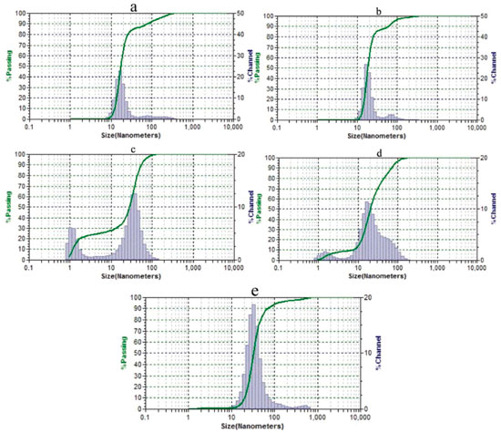 Figure 4. Hydrodynamic size distribution diagrams of nanoparticles. Sample containing KOH, HAuCl4 and γ-cyclodextrin without microwave irradiation (a); samples containing KOH, HAuCl4, and α- (b), β- (c) or γ-cyclodextrins (d) after microwave irradiation; and sample containing only KOH and HAuCl4 after microwave irradiation (e)