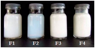 Both droplet size and PdI were highly dependent on the surfactant and cosurfactant present in the colloidal formulations. The smallest droplet sizes (< 100 nm) were obtained in the formulations prepared using HCO-40 and SIS surfactants compared to that one prepared with SML-20 and SMO (p < 0.05). In addition, F1 and F2 formulations demonstrated a narrow droplet size distribution (PdI < 0.2) whereas F3 and F4 formulations had the widest size distributions (PdI ≥ 0.4) comprising of a bimodal distribution with larger and more polydisperse droplets (Figure 1). On the other hand, oil type (MCT and MO) did not demonstrate influence on droplet size and PdI (p < 0.05) for all NE formulations. The appearance of NE formulations varied greatly from translucent or slightly turbid to opaque and F2 formulation was the most translucence preparation with strong bluish reflection (Figure 2). For all developed nanoemulsion formulations, highly negative surface charges were observed (Table 2). These negative zeta potential values contribute for storage stability of nanoemulsion since the repulsive forces exceed attractive forces among droplets and such droplet–droplet repulsion prevents the coagulation and/or coalescence of dispersed phase of emulsions.11