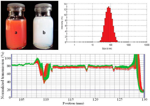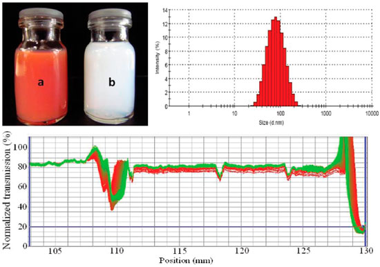 Figure 3. Photoimages of (a) NE containing lapachol at 1 mg mL-1 (F2-Lp) and (b) unloaded F2 NE. Results from F2-Lp formulation of droplet size distribution (top right) and analytic centrifugation with LUMiSizer® (bottom image)
