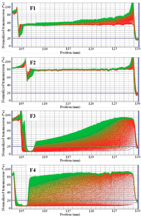 ![]() Figure 4. Normalized NIR transmission profiles obtained with unloaded NE (F1-F4) by forced stability analysis during analytical centrifugation with LUMiSizer®. The first and the last registered profiles are shown in red and in green, respectively