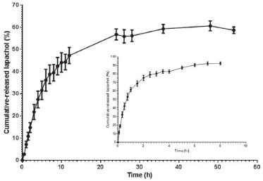 ![]() Figure 5. In vitro release profile of lapachol from F2-Lp formulation prepared using EPI method. Result shown in the inset represents in vitro release of free lapachol from hydroalcoholic dispersion. All results were reported as average ±SEM (n = 3)