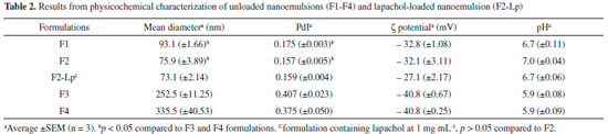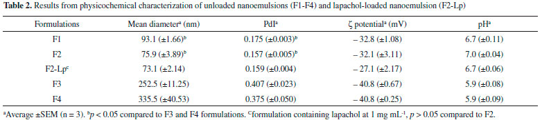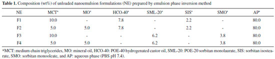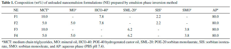 EXPERIMENTAL Materials Mineral oil (MO), polyoxyethylen-20 sorbitan monolaurate (SML-20), and sorbitan monooleate (SMO) were purchased from Sigma-Aldrich Co. (St. Louis, MO). Medium chain triglycerides (MCT), POE-40 hydrogenated castor oil (HCO-40), and sorbitan isostearate (SIS) were kindly supplied from Croda do Brasil Ltda (Campinas, SP, Brazil). Lapachol (Lp) was provided by Research Group of Chemistry Applied to Pharmacy from UNIVASF. Nanoemulsion preparation Oil-in-water (O/W) nanoemulsions (NE) were prepared using the emulsion phase inversion method.16 Both the oil and aqueous phases were separately prepared, organic phase was obtained by mixing surfactants and oils under moderate stirring while aqueous phase consisted of phosphate buffer solution (PBS pH 7.4). Nanoemulsions were prepared by slowly adding aqueous phase to the organic phase and the resulting systems held in continuous stirring. Colloidal dispersions were formed of oils (MCT and MO), surfactants (HCO-40, SML-20, SIS, and SMO), and phosphate buffer solution as can be seen in Table 1. Organic phase concentration and surfactant-to-oil weight ratio were kept constant at 10.0 wt% and 1.0, respectively. Nanoemulsions were optimized by means of a formulation study in which the influence of the surfactant pairs (final HLB 12) and oil type (Table 1) were assessed on the main physicochemical properties of emulsified droplet. All formulations were prepared in triplicate (n=12) and stored at 4 ± 2° C. NE loaded with lapachol (F2-Lp) were prepared by adding different amounts (0.1, 0.6, 1.0, and 1.25 mg mL-1) of this naphthoquinone in oily phase and using same procedure in order to prepare unloaded F2 nanoemulsion.