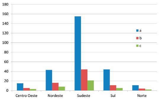 ![]() Figura 3. Gráfico comparativo da distribuiçao geográfica de acordo com o número de centros/museus de ciências no guia da ABCMC (a), do número de respondentes por meio eletrônico, telefônico ou sítio eletrônico (b) e do número de instituiçoes que possuem Química (c)